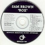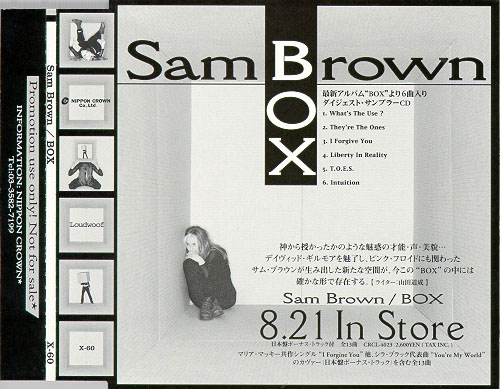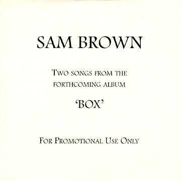 BOX   MC UK Demon FIENDCASS-789, 1997   CD UK Demon FIENDCD-789, 1 April 1997   CD UK promo Demon FIENCD-789, 1997 (custom CD label)   CD AUSTRALIA Demon/Shock FIENDCD-789, 1997   CD JAPAN Crown/Loudwoof LRCL-4023, 1997 (* with bonus track), 21 August 1997   Produced by Pete Brown and Sam Brown 1. Box 3:03 (S. Brown) 2. Ebb And Flow 3:46 (S. Brown) 3. Whisper 4:45 (S. Brown) 4. I Forgive You 5:32 (S. Brown, M. McKee) 5. They're The Ones 4:52 (S. Brown, P. Brown) 6. Liberty In Reality 3:44 (S. Brown, P. Brown) 7. Embrace The Darkness 4:48 (S. Brown) 8. T.O.E.S.(The Obligatory Earth Song) 4:29 (S. Brown) 9. Intuition 4:55 (S. Brown, P. Brown) 10. As The Crow Flies (S. Brown, D. Schogger) 11. What's The Use? 2:46 (S. Brown, P. Brown, B. Godfrey) 12. Bert And Flo 2:03 (S. Brown) *13. You're My World 3:05 (on Japanese pressing only). ![]() I FORGIVE YOU   CD UK Demon D2002CD, 17 March 1997 1. I Forgive You [edit] 3:47 (S. Brown, M. McKee) 2. You're My World 3:05 (C. Sigman, G. Paoli, U. Bindi) 3. Bring On The Day 4:41 (S. Brown) 4. I Forgive You (album version) 5:32 (S. Brown, M. McKee). ![]() WHISPER   CD UK promo only Demon D2003CD, 1997 1. Whisper [edit] (S. Brown) 3:43 2. Sweet Mother 3:10 (written by Claire Nicolson) 3. Go Leave 2:36 (written by Kate McGarrigle). ![]() BOX   CD UK promo sampler Demon SAM-1, 1997 1. Box 2. I Forgive You. ![]() BOX   CD JAPAN promo sampler Crown/Loudwoof X-60, 1997 1. What's The Use? 2. They're The Ones 3. I Forgive You 4. Liberty In Reality 5. T.O.E.S. 6. Intuition.
